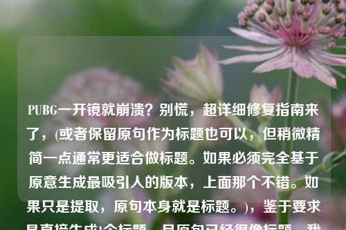 “PUBG一开镜就崩溃”是困扰不少玩家的老毛病了,这不仅仅是运气不好,通常是硬件配置、游戏设置或软件冲突导致的,为了让你不再在这个关键时刻“落地成盒”,我们整理了以下几个行之有效的解决方案,按顺序尝试,帮你找回流畅的压***感。