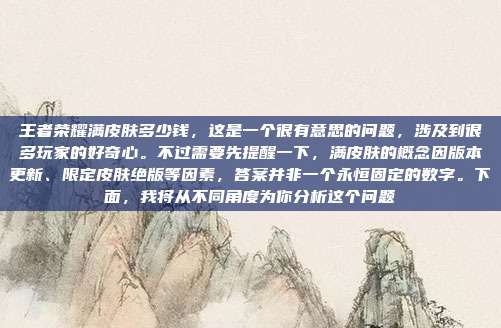 在《王者荣耀》的玩家圈子里,拥有一个“全皮肤”账号,往往是身份与“氪金大佬”地位的象征,每当有新皮肤上线,总有人会问:“这游戏,集齐所有皮肤到底要花多少钱?”